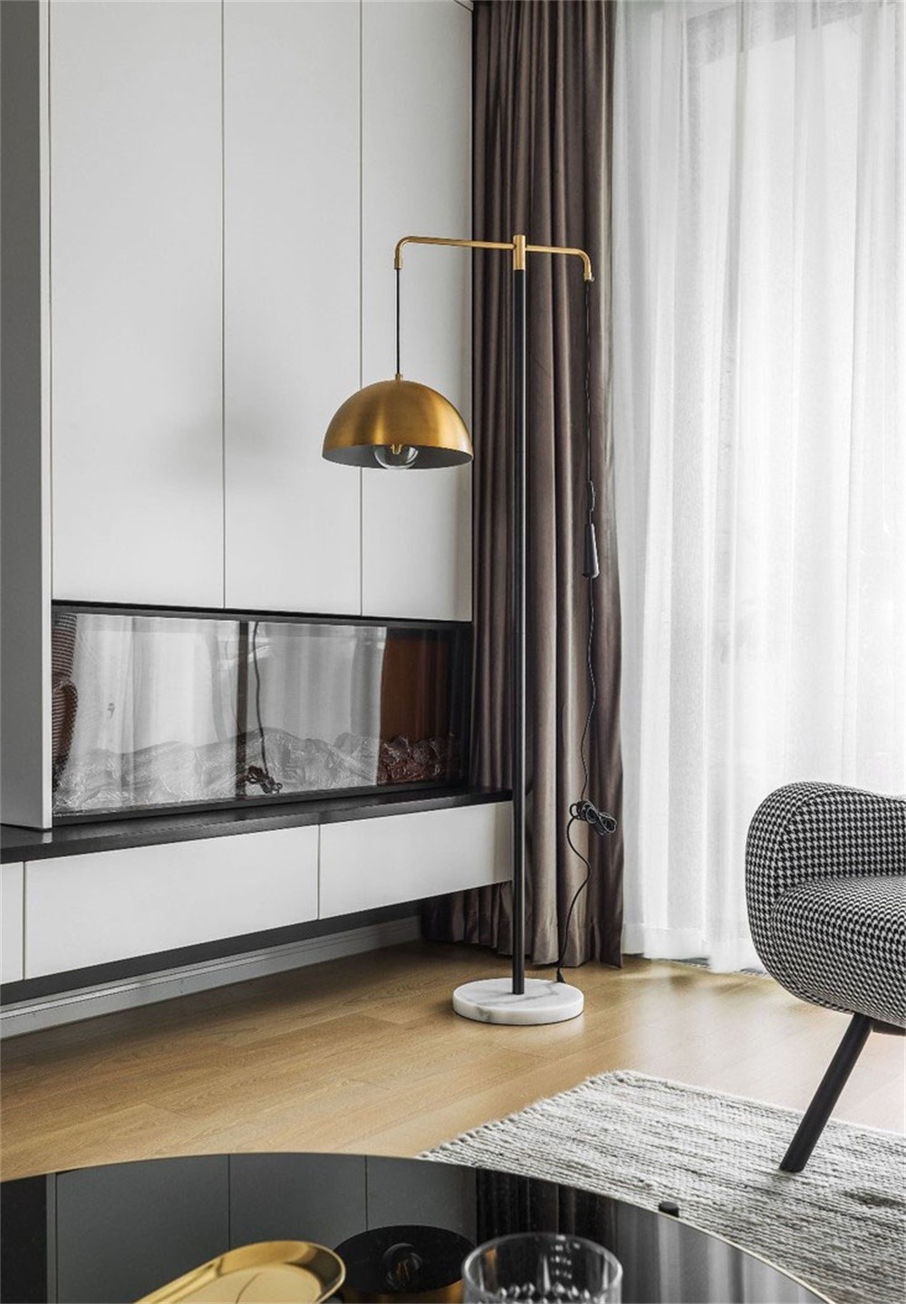 絲絨質感的沙發搭配金屬角的玻璃茶幾,造型別致的糖葫蘆角幾、有趣的抱枕圖案、集實用與美觀于一體的電視柜有了壁爐的襯托讓客廳空間加分,營造出一個愜意輕松的生活氛圍,既混搭又精致。
