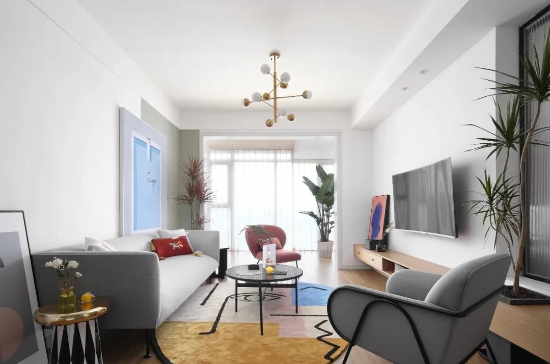 粉色休閑椅、在掛畫與地毯、綠植也是加入了粉色的元素,使得簡約的空間更加浪漫雅致。頂上一盞金屬色的吊燈,則是增添了空間的華麗檔次感